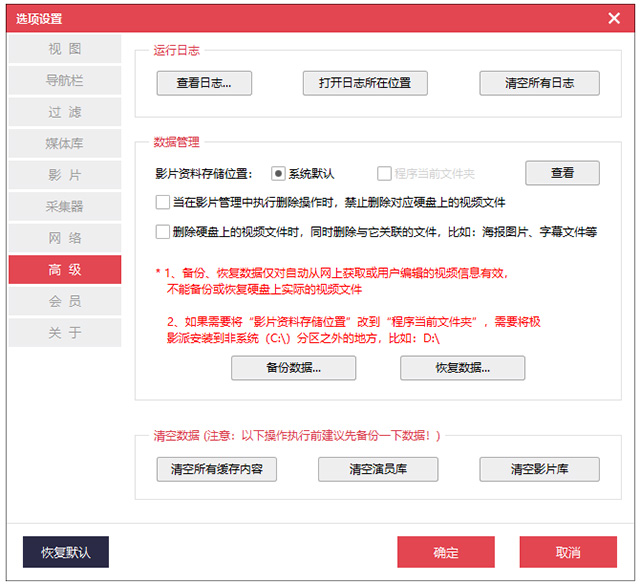 3、在高级选项中,你会看到一个名为”清空影片库“的按钮。