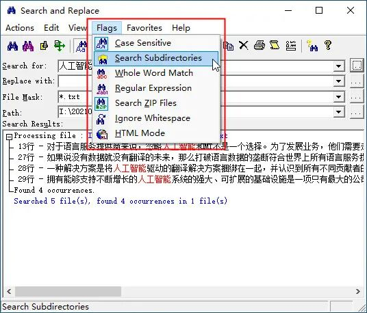 2、使用这款工具时,有关搜索的设置,是在导航栏和Flags菜单里面。功能包括:查找时是否区分大小写、是否搜索子文件夹、是否全字匹配、是否搜索ZIP文件、是否使用正则表达式等。