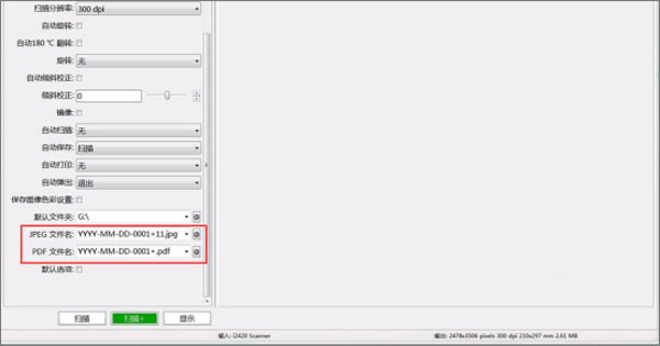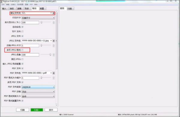 5、之后在软件的输出设置模块,我们可以设置默认扫描输出的保存文件夹,然后在这里勾选多页JPEG格式这个选项,其他的参数再根据自己的需求进行调整之后,点击下方的扫描按钮即可。
