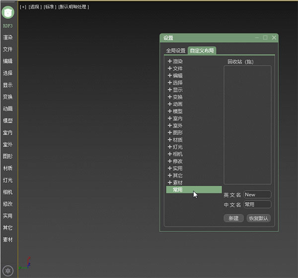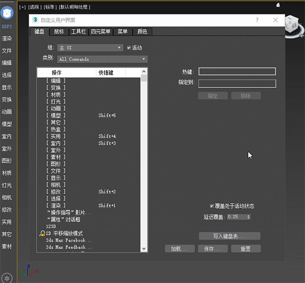 4、所有功能支持快捷键,点击LOGO即可搜索任何功能。所以尽管插件功能繁多,也能迅速地找到您的菜。(设置快捷键的方法是:在Max快捷键设置中选择RDF或RDFs分类,其中前者为功能型,后者为界面型,搜索框同样支持快捷键呼出)
