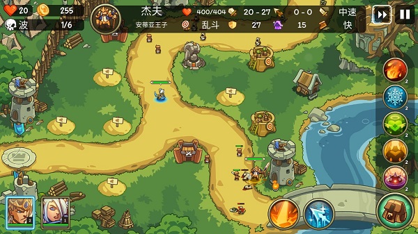 在进入战斗时我们三位英雄边上的土包就是我们需要建造防御塔的地方了,只需要点击土包然后选择防御塔的类型点击对号就可以创建成功,如果金币足够多的话是可以升级你的防御塔的等级越高攻击伤害越大。如果金币不多的话那么优先升级在路口前端最先和敌人战斗的防御塔。