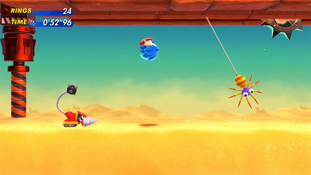 从关卡起点出发,向右行进,从两个弹板处顺着斜坡向下,沿着这条路径一直向右走,你会遇到一只“缓冲蟹”敌人以及一个弹跳平台,它会将你带到右侧的高处。