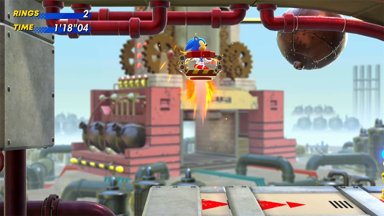 接下来,向右行进并保持该方向,直到到达一条能将你弹射得更远的加速轨道。从那里开始,一直向右行进,直到到达一个有三条高速轨道叠在一起的区域。利用它们到达最上方的轨道,从而被弹射到另一个区域。