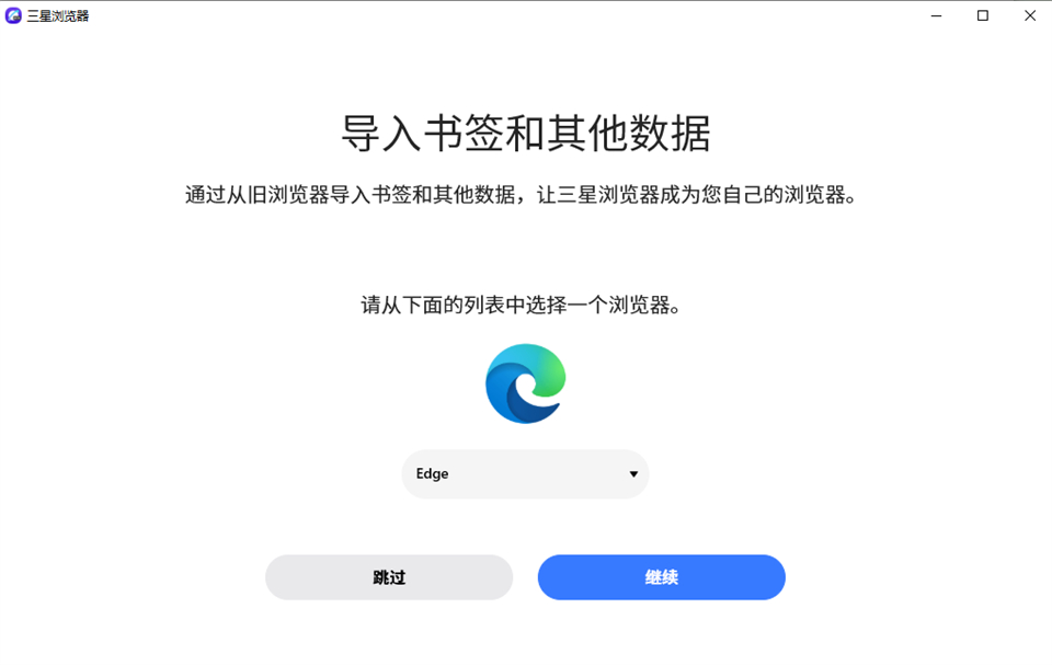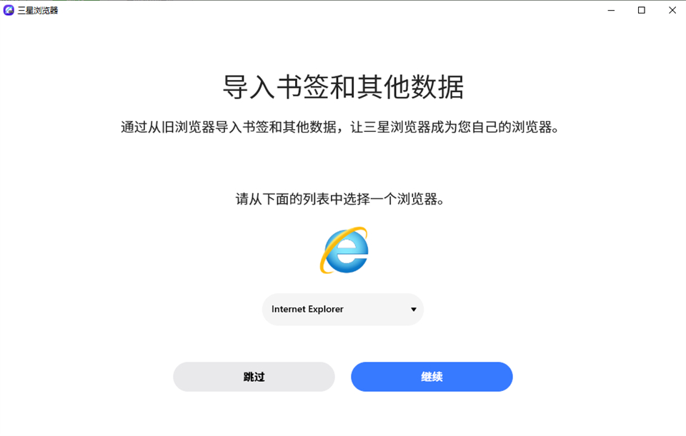 1、下载好运行浏览器,选择一个之前的旧浏览器,导入书签和其他数据到三星浏览器