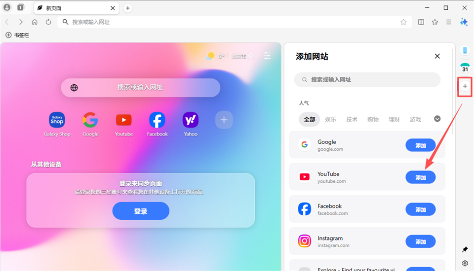 7、点击右侧添加还可以快速添加众多人气网站