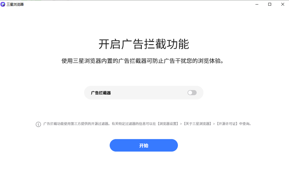 3、点击开启【广告拦截器】,可防止广告干扰您的浏览体验,然后点击【开始】