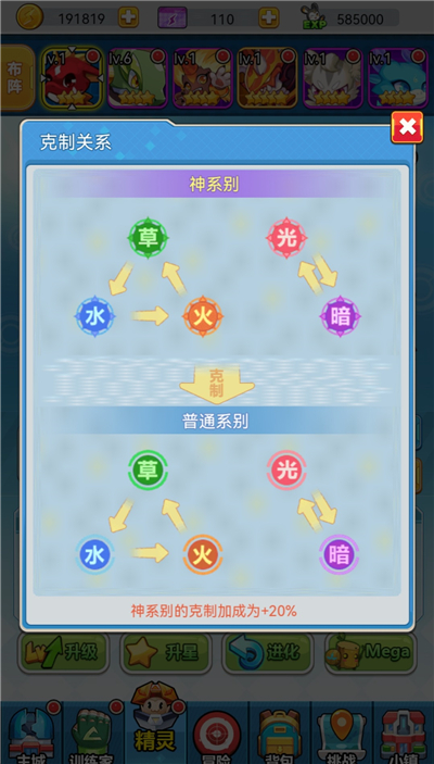 游戏中有很多精灵可以收集,每个精灵都有独特的技能和属性,比如草、水、木相互克制,光和暗也互相克制。而神系别的精灵对普通系别有20%的加成优势,这让策略性更强了。