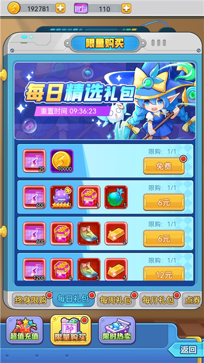 1、点击游戏上方点卷旁边的+号,在【终身限购】这一栏里可以免费领取20点券。