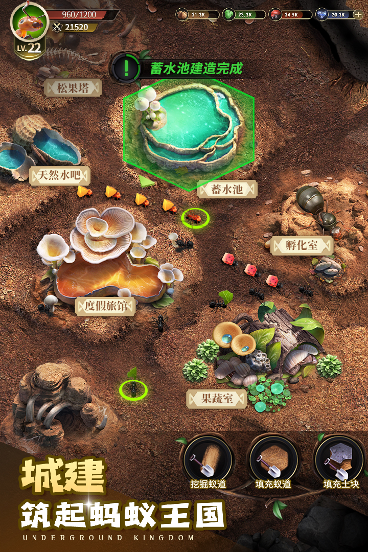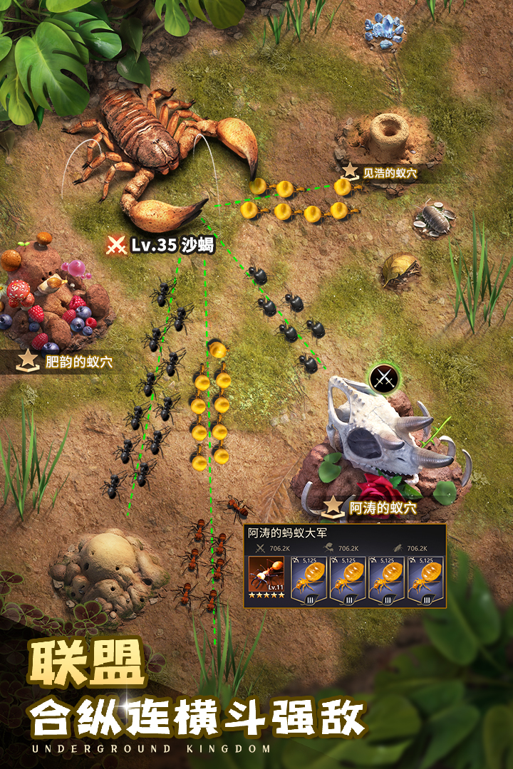 《小小蚁国》是一款3D写实风格的蚂蚁题材战争策略手游。玩家扮演蚁巢之主,从零开始规划和建造复杂的地下蚁道与功能建筑,指挥工蚁采集资源、繁育兵蚁,组建军团,在地表世界对抗蜥蜴、螳螂等天敌。游戏还加入了联盟系统,玩家可以与盟友合作扩张领地。