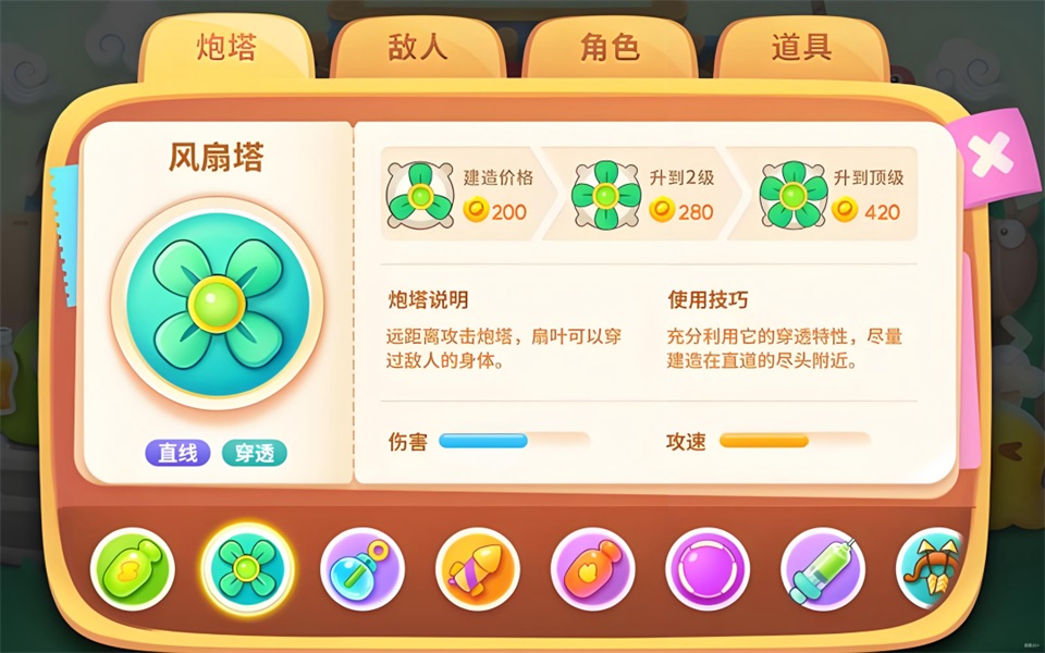 用法:前期杀伤力一般,升到满级后满屏扇叶纷飞,一条路上的所有兔子都能被波及,看着超解压!