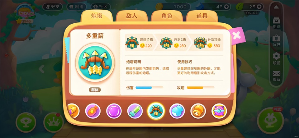 用法:后期敌人变多时,能同时攻击多个目标;还能以中间建筑为 “跳板”,用多余箭矢打远处建筑,间接拆障碍。