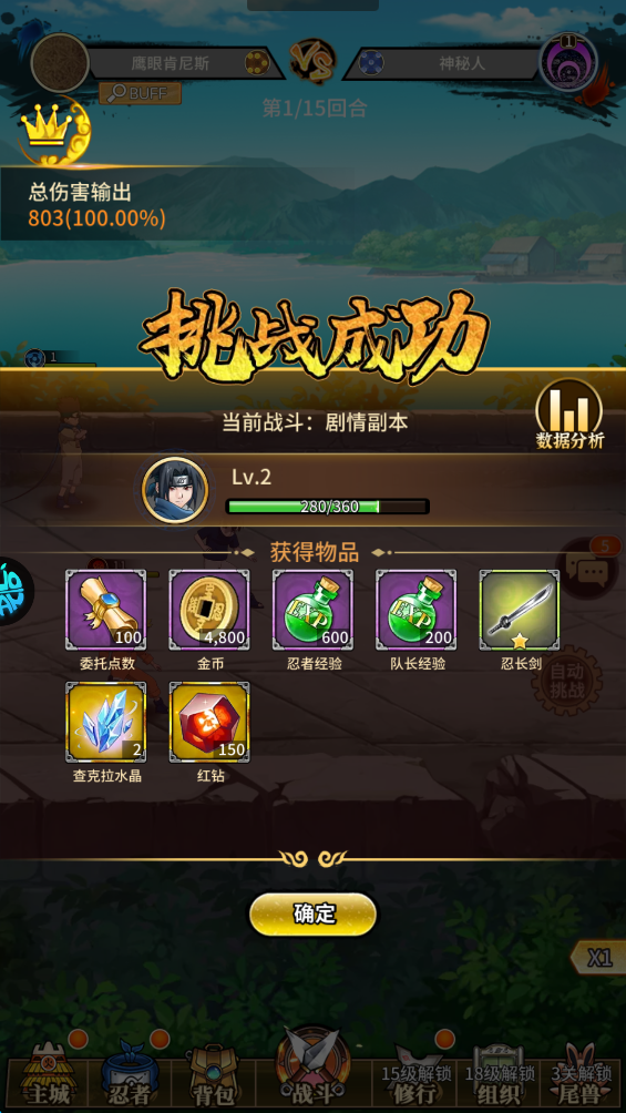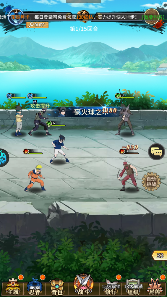 游戏贴心设置了自动闯关和一键跳过战斗功能,玩家无需手动重复操作枯燥的战斗流程,既能快速获取升级所需资源,又能把精力放在忍者阵容搭配、战术制定上。