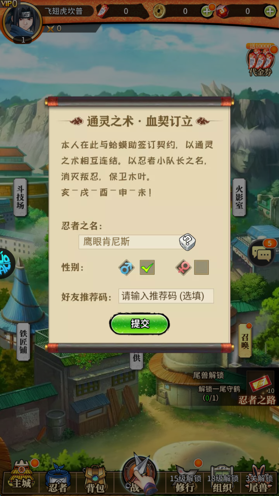 1、游戏开始,输入角色昵称和选择性别,随后点击“提交”。