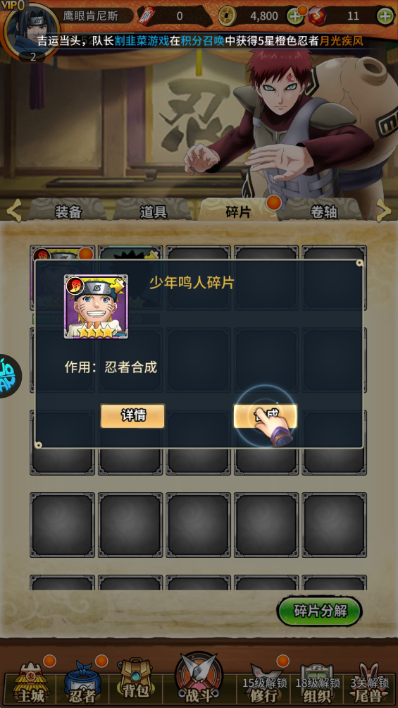 3、部分的忍者还可以通过闯关或者其他活动获取忍者碎片,最后合成即可。