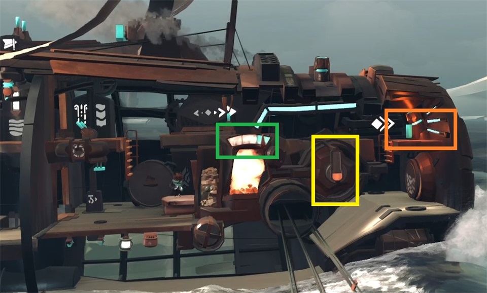 你会找到一个装有 6 次充能(满格时)的油罐,总共需要修复船只 10 次。如果你难以达成这个成就(那说明你玩得太完美了),那就别在燃烧器激活时冷却引擎,或者在经过桥洞时别降下船帆。必要时,你可以保留当前损伤状态并重新加载检查点,以累计达到10次维修。