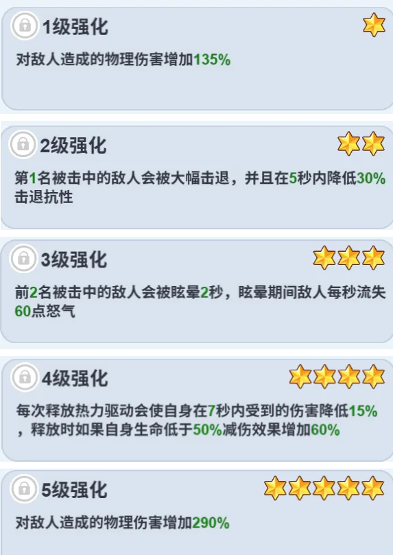 奥义12级:每次释放热力驱动后会在地面留下持续6秒的火焰,处于火焰中的敌人怒气回复速度降低5%(10%),处于火焰中的自身与友军增加10%(20%)防御(专属指令全部彩色后激活加强)