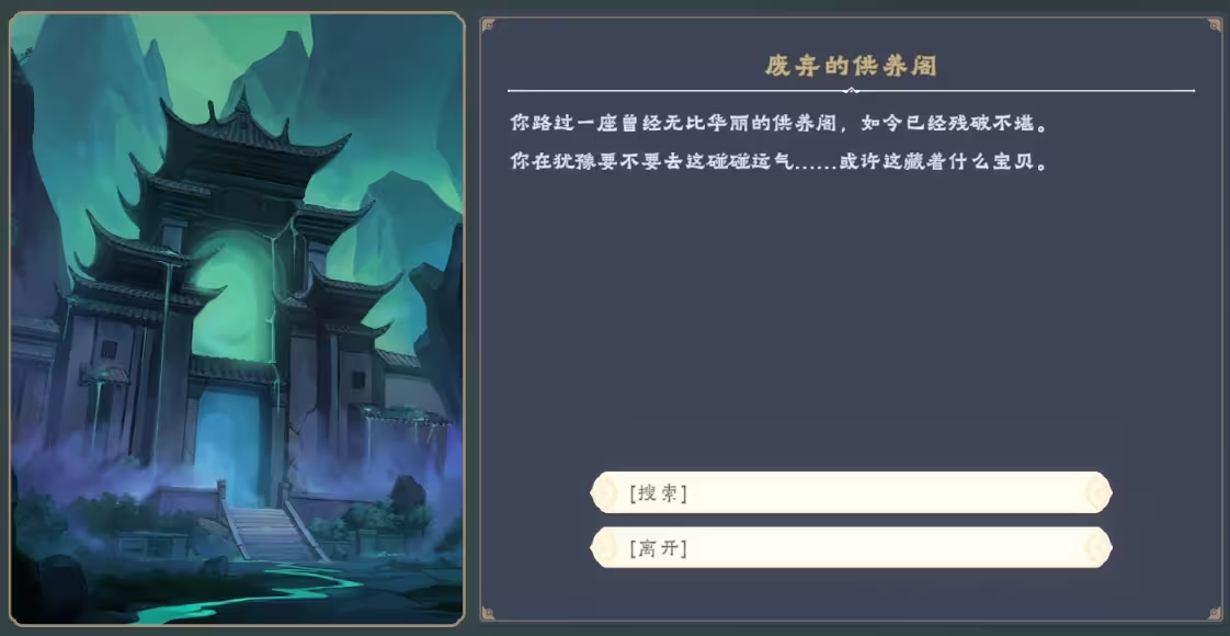 选择【搜索】概率获得遗物、概率获得祭品4选2、概率获得破碗(祭品槽-1)。