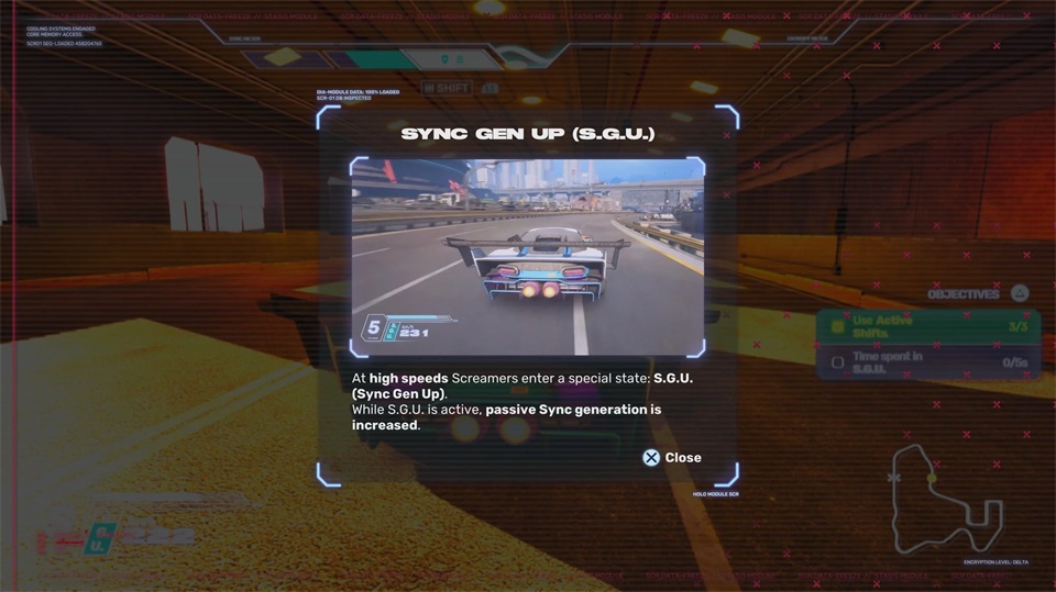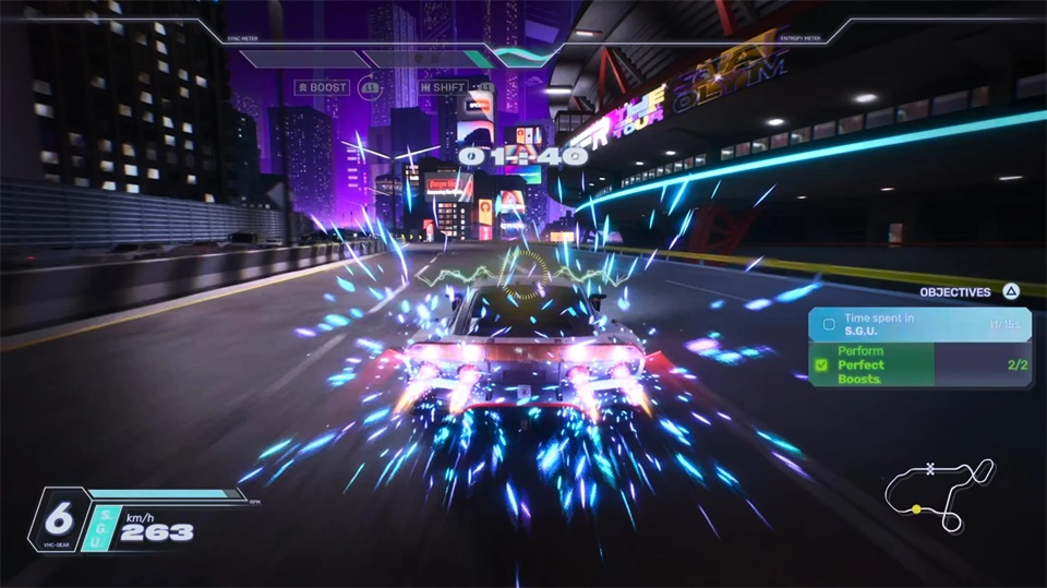 《Screamer》包含多种机制,其中“同步”和“熵”计量表最为关键。比赛开始时,你将逐步积累“同步”值,而每次使用“加速”都会增加“熵”计量表的数值。需要记住的一点是:如果你消耗“熵”来发动“打击”并击倒对手,你将获得更多的“同步”值。