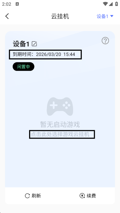 3、进入云挂机页面后,点击黑框标注的"点击此处选择游戏云挂机"区域,弹出游戏选择窗口;