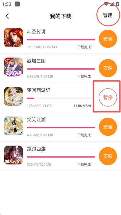 3、进入"我的下载"页面后,可查看下载进度,点击红框标注的 "暂停"按钮,可暂停下载,点击右上角红圈标注的 "管理"按钮,可选择下载任务,进行删除。
