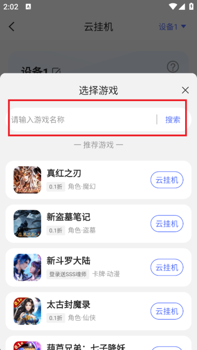4、可在红框标注的搜索栏输入游戏名称精准查找,也可直接在推荐游戏列表中选择目标游戏,找到目标游戏后,点击右侧"云挂机"按钮,即可启动云端挂机。