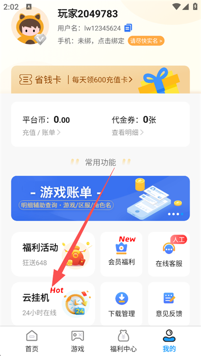2、在个人中心的"常用功能"区域,点击红箭头标注的 "云挂机"图标,进入云挂机管理页面;