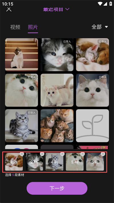 4、在"最近项目"中勾选要制作视频的照片(至少选择对应模板要求的数量),已选素材会显示在底部栏,确认后点击下一步;