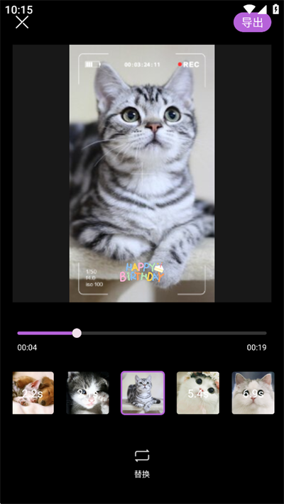 5、进入编辑页,可拖动时间轴预览视频效果,如需替换照片,点击底部替换按钮重新选择素材,确认无误后,点击右上角导出;