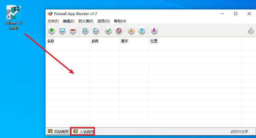 18、点击【入站规则】,将桌面【EViews 12 (x64)】图标拖到软件中。