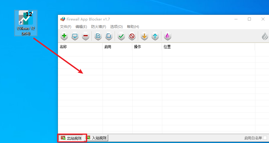 17、点击【出站规则】,将桌面【EViews 12 (x64)】图标拖到软件中。