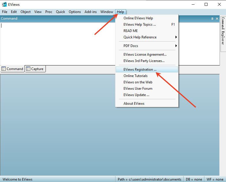 20、点击最上方【Help】选择【Eviews Registration...】。