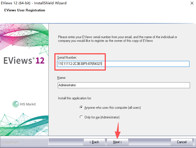 5、输入Serial Number:【11E11112 – 2C3B30F5 – 87654321】,点击【Next】。