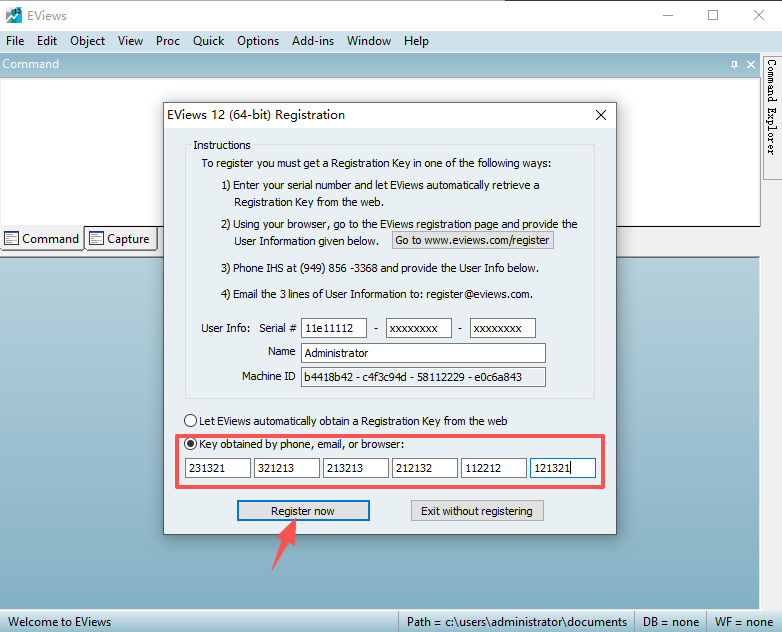 21、选择【Key...】,输入代码【231321-321213-213213-212132-112212-121321】,点击【Register now】。