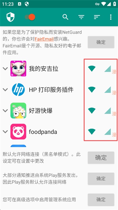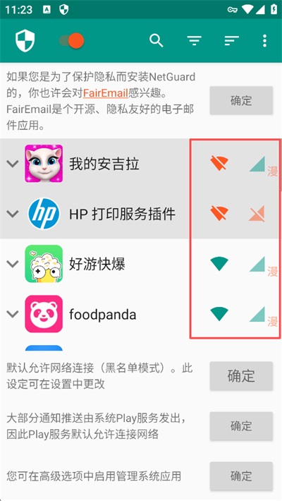 3、青色:允许联网;橙色:阻止联网。点击图标即可切换。