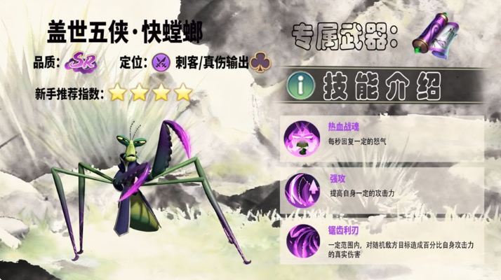 第二步就是要选择自己的初始阵容了,如果只追求开荒推荐使用盖世五侠基础队(盖世无侠快螳螂+俏小龙+猴王+悍娇虎),这套阵容的优势在于英雄全免费、易成型。核心输出快螳螂可以说是PVE前期推图神器,其技能不仅爆发伤害高还为真伤输出,不管是小怪还是BOSS,一套技能就能打半血。