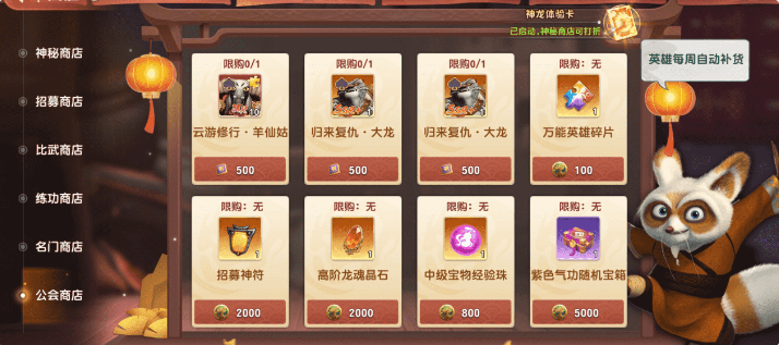 5.神秘商店:可以购买心法,提升英雄等级,提高战力