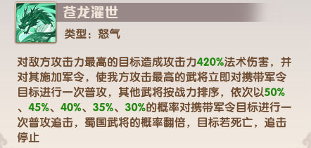 对敌方攻击力最高的目标造成攻击力420%法术伤害,并对其施加军令,使我方攻击最高的武将立即对携带军令目标进行一次普攻,其他武将按战力排序,依次以50%、45%、40%、35%、30%的概率对携带军令目标进行一次普攻追击,蜀国武将的概率翻倍,目标若死亡,追击停止。