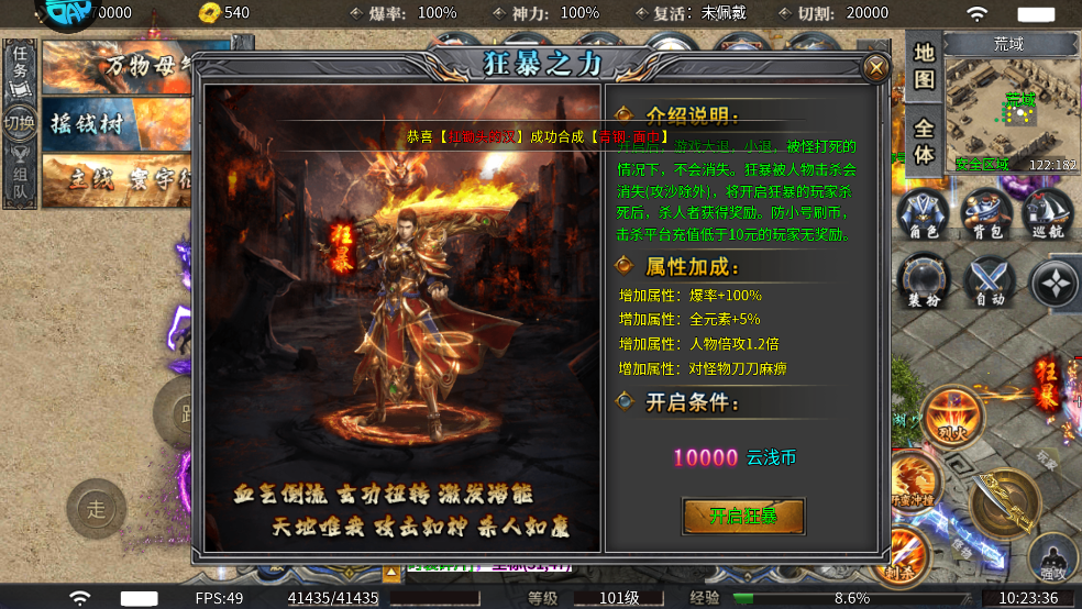游戏最大的特色是元宝全靠打,小怪也能爆极品装备,回归了经典的传奇玩法。每个大陆都有专属奖励和福利BOSS,刷起来特别带感,完全没坑,玩起来很舒服。特别是狂暴之力这个设定,属性加成超猛,爆率直接翻倍,对怪物还能刀刀麻痹,简直爽到飞起。