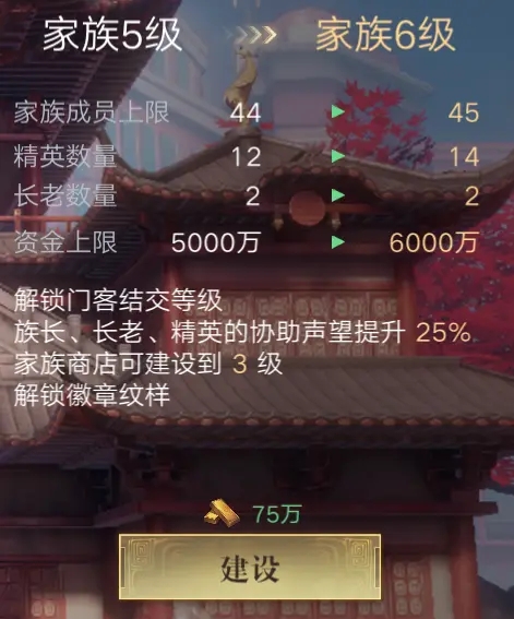 家族建设分为大厅升级和商店升级,均为使用家族资金进行建设升级。