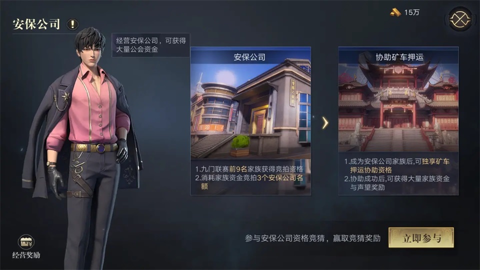 获取资格:九门联赛前9名家族获得竞拍资格,消耗家族资金竞拍3个安保公司名额。