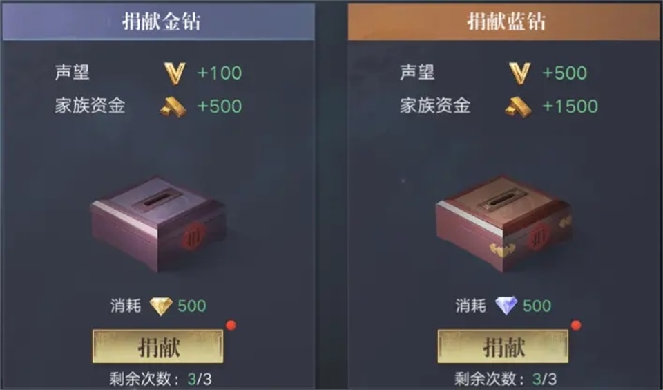 捐献500金钻,获得100点声望,增加500家族资金。