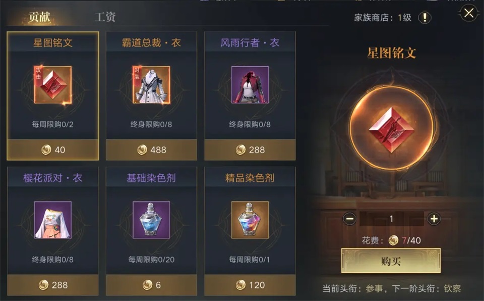 家族商店中可购买的商品根据消耗货币分为两类:家族贡献和工资,家族商店等级提升后道具逐渐开放。