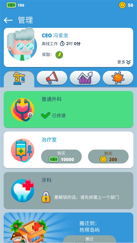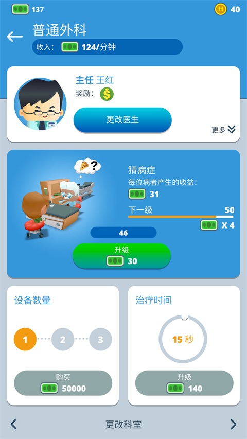 2、主治医生同样可以升级来提高治疗效率,也可以购买设备;