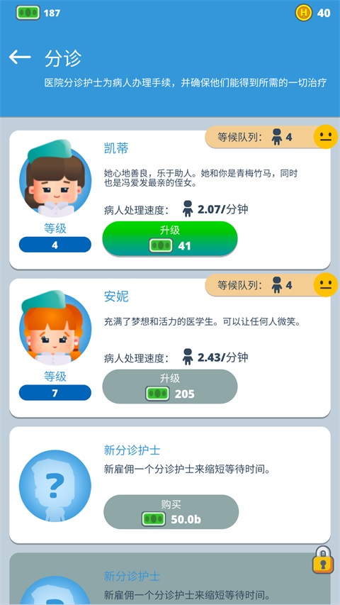 1、游戏中完美还原医院流程,首先需要玩家升级或购买更多分诊医生,帮助病人更好办理手续;