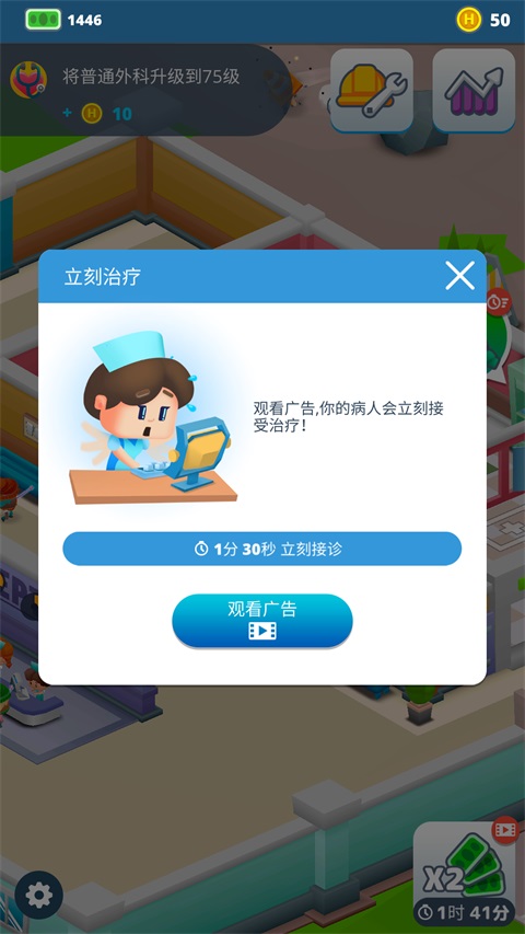 一开始我也没太明白怎么快速治疗病人,后来发现升级分诊医生和主治医生能提高效率,买设备增加治疗室也很重要。还有点小窍门就是看广告能直接加速治疗进度,虽然有点无奈,但也算个办法吧。