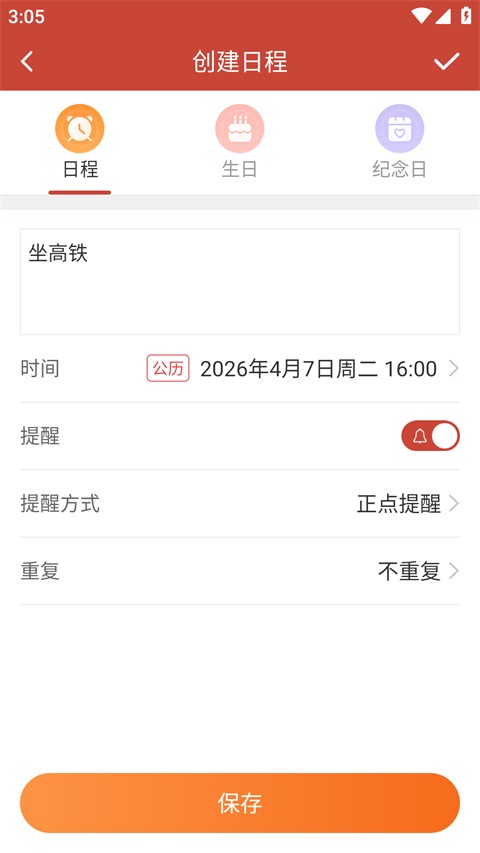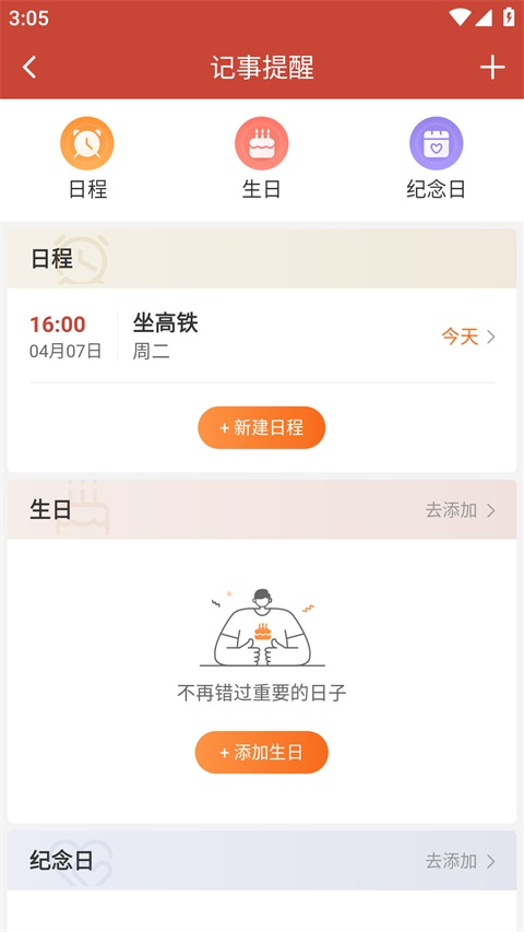 2、根据用户需求选择日程、生日、纪念日提醒选项;