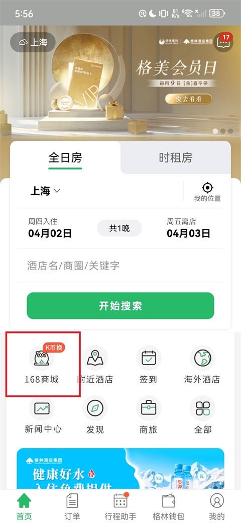 1、打开格林APP,点击首页的"168商城";