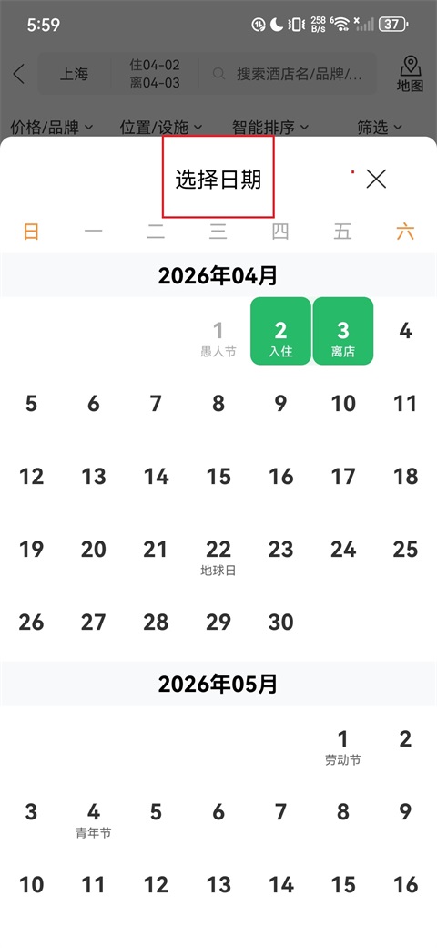 2、选择入住城市,点击"选择日期",选定入住和离店日期;