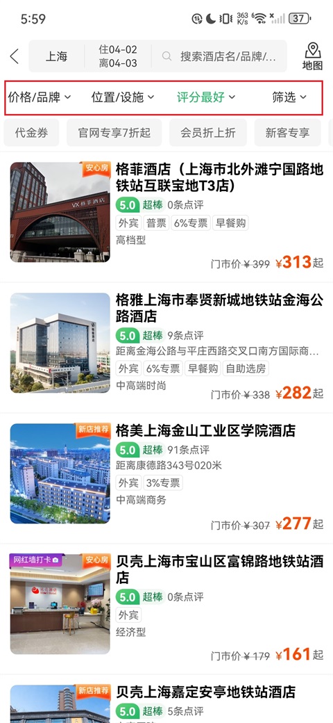 3、在酒店列表页,可通过"价格/品牌""位置/设施""评分最好""筛选"等条件,筛选目标酒店;