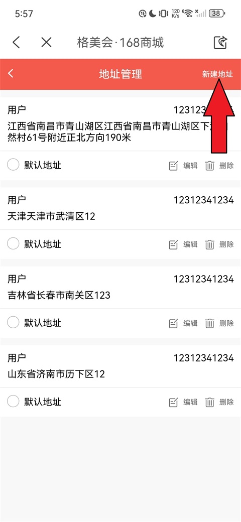 4、进入地址管理页面后,点击右上角的"新建地址";